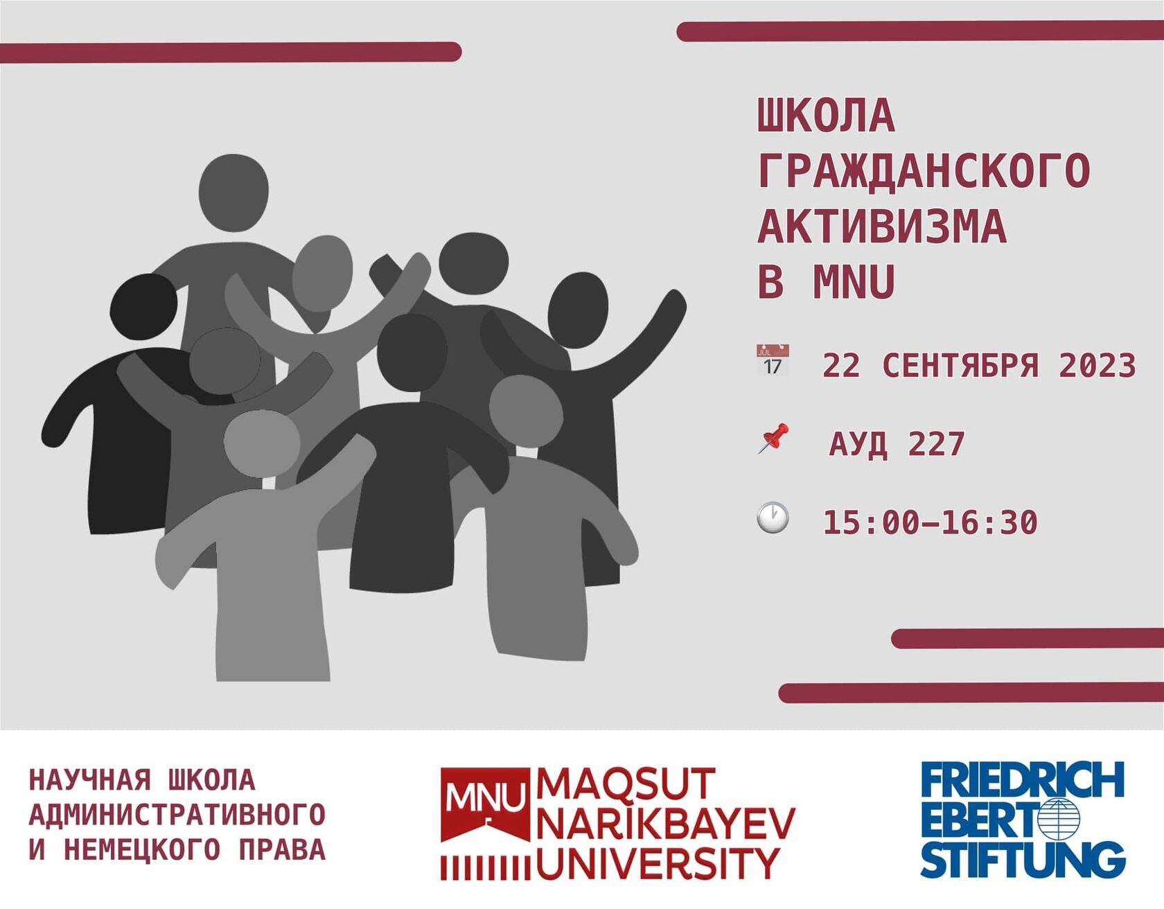 Приглашаем вас на третью встречу в рамках «Школы гражданского активизма в Маqsut Narikbayev University», организованной Школа немецкого права Maqsut Narikbayev University совместно с Friedrich Ebert Foundation Kazakhstan.